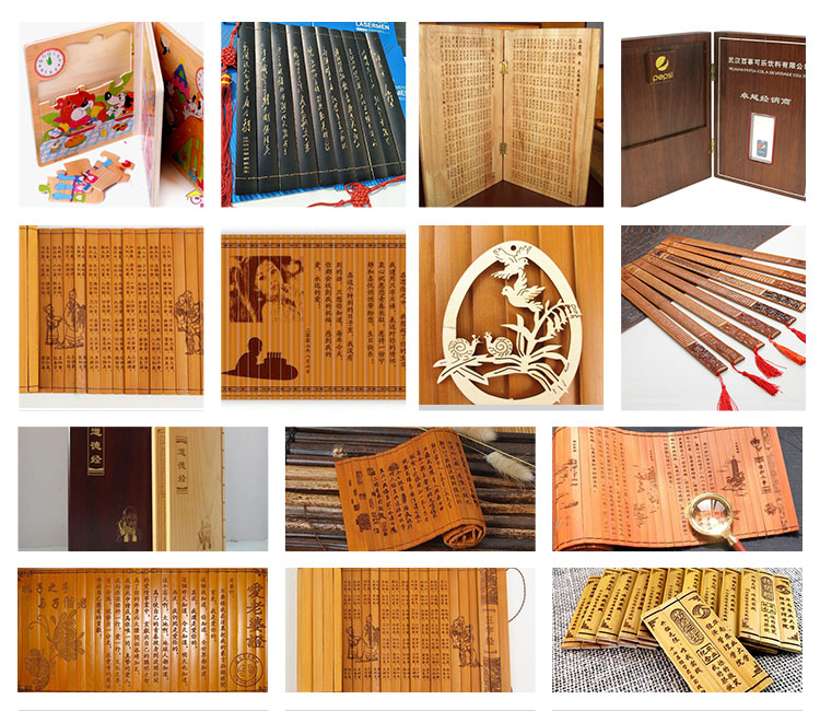 竹簡木書激光雕刻切割機集計算機輔助設計,數控技術于一體,實現全電腦設計,全自動化控制,可在各種非金屬材料的表面進行雕刻與切割。設備運行速度快、精度高、操作簡單、使用成本低、雕刻效果好??傻窨?、切割任意圖案,切割邊緣無毛刺、無鋸齒、拼圖縫隙小、不變形,無需二次打磨;切割廢料少,省工省料;雕刻深度可自主調節,極大地滿足了工藝禮品、廣告行業的需要。